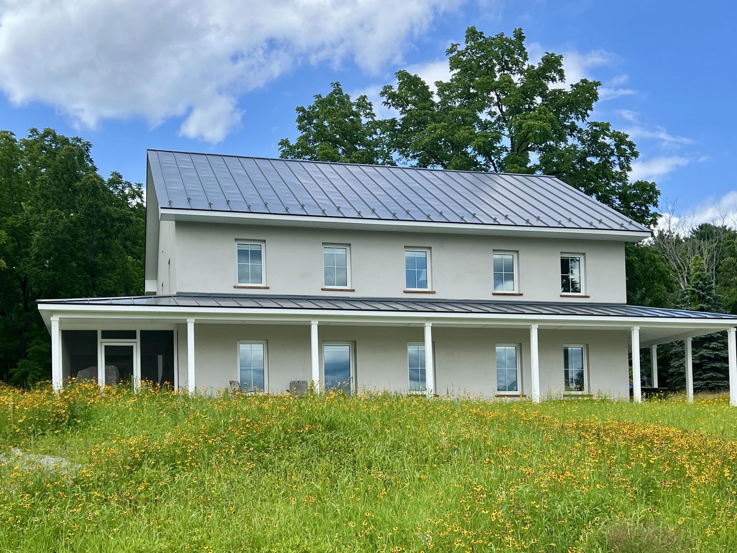 The Bellwether on Main duplex in September, 2024; the stucco is completed. We have kept the windows and doors taped for painting. The home on the left is three bays wide. The second unit is two bays wide, with a side entrance. The AAC block structure is wrapped on the exterior with 6” of Rockwool Comfortboard 80, finished with U-Stucco. Both homes are designed to meet net-Zero energy including charging electric vehicles. The building will provide extraordinary energy efficiency, comfort, and resiliency, as well as blending well with the surrounding historic homes and businesses. The standing-seam steel roof for the porch will be installed after the walls are painted.