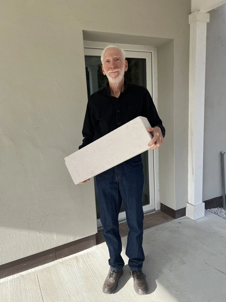 Dan holding a 200 x 200 x600 mm (8” x 8” x 24”) AAC block, ~32 pounds